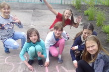 Ребята рисовали на асфальте рисунки по теме “Каникулы – чудесная пора”.