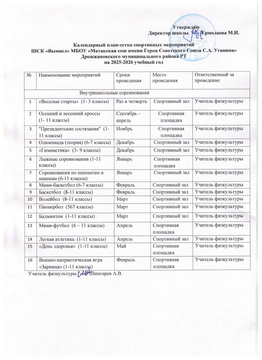 Календарный план сетка спортивных мероприятий ШСК "Вымпел" на 2025-2026 учебный год