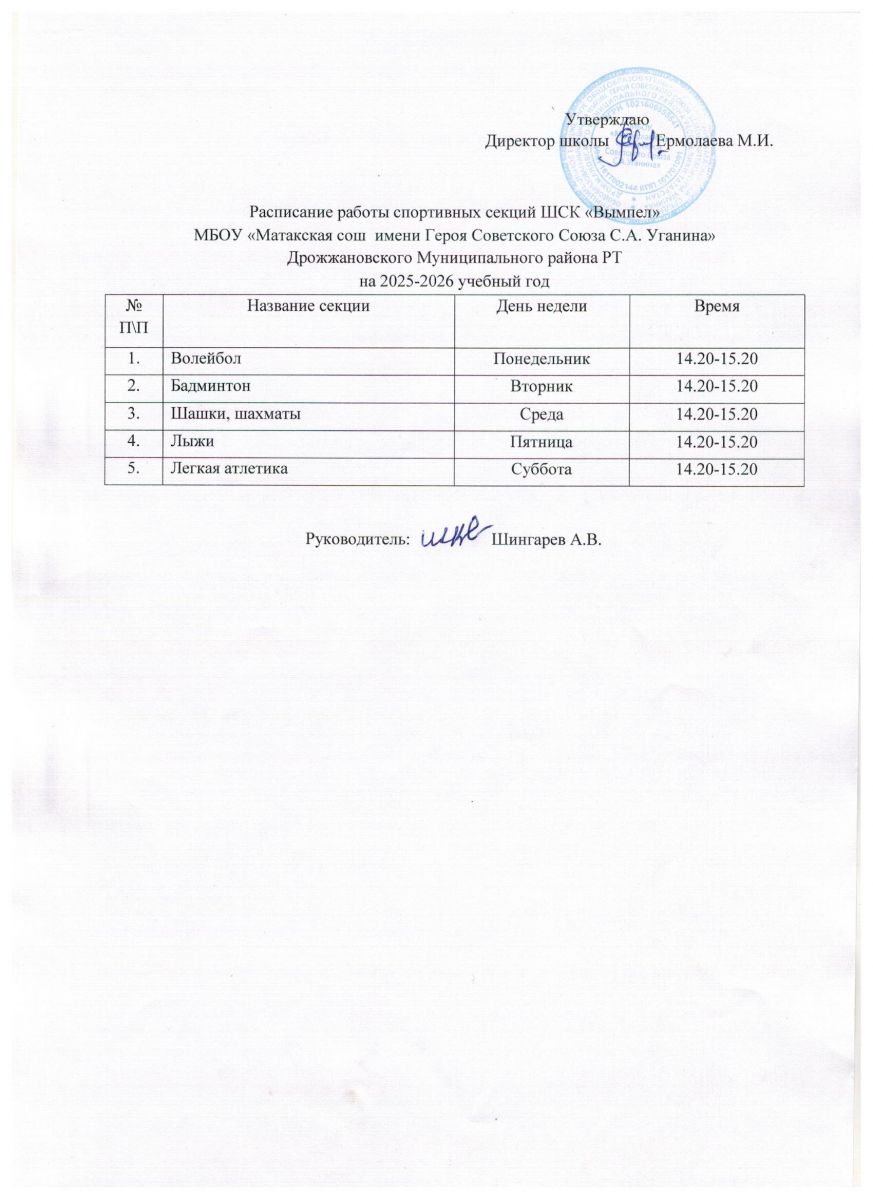 Расписание работы ШСК "Вымпел" а 2025-2026 учебный год
