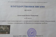 Воспитанница подготовительной группы Ахметова Ризиля получила 3 место на первом этапе международного литературного конкурса чтецов “Джалиловские чтения” в номинации “М.Джалиль на татарском” до 8 лет.Вручили благодарственное письмо.