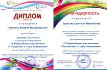 Малянова Алексея, занявшего 1 место в дистанционном мероприятии II Всероссийской игры-викторины "Путешествие в страну Языкознанию".