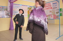 В спортивном зале МБОУ «Новоильмовская средняя общеобразовательная школа» 18 февраля под звуки марша «Вольная борьба» участники турнира заходят в зал и руководитель парада докладывает главе Дрожжановского района Александру Шадрикову о готовности спортсменов к турниру.