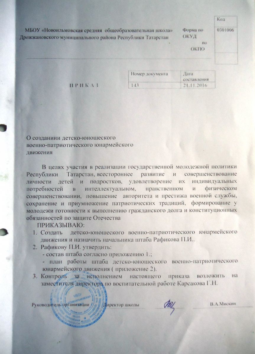 Приказ по школе " О создании детско - юношеского военно- патриотического юнармейского движения "