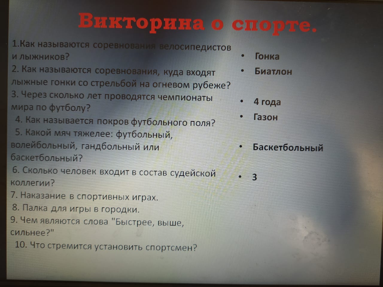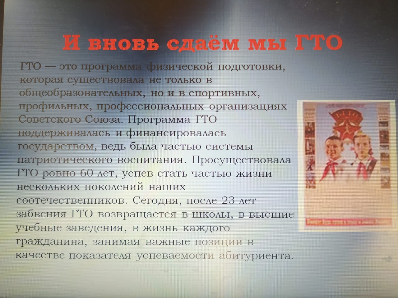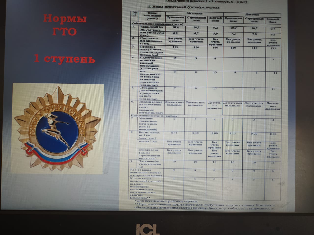 Опубликовано: 16.03.2021Сегодня в нашей школе провели открытый урок посвященный теме "Что такое ГТО". Учителя физической культуры рассказали учащимся историю возникновения комплекса ГТО, значения выполнения нормативов ГТО. Была показана презентация, продемонстрированы знаки ГТО, порядок выполнения испытаний по комплексу ГТО.