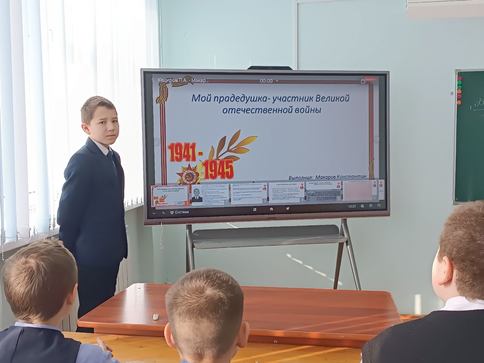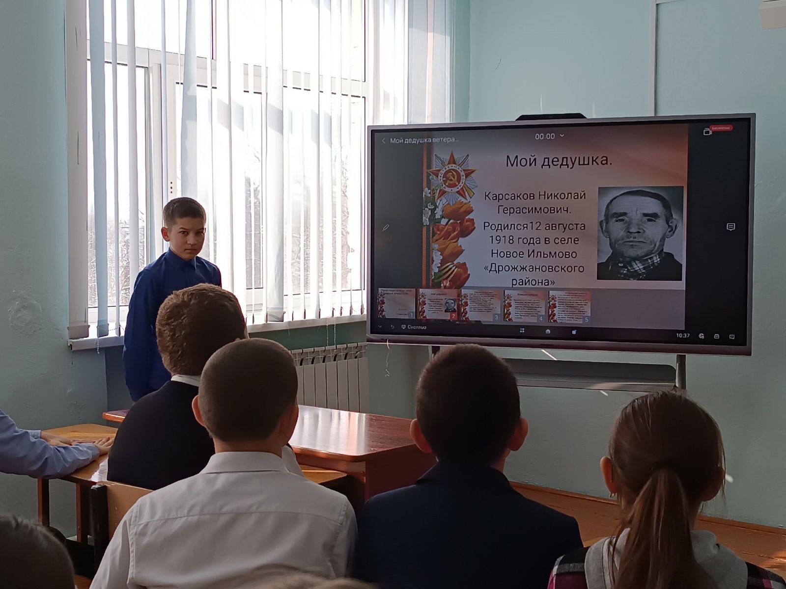 Опубликовано: 22.02.2025На днях учащиеся 6 класса нашей школы представили увлекательную исследовательскую работу на тему «ВОВ в истории моей семьи. Боевой путь моего деда, прадеда». В ходе презентации ребята поделились с одноклассниками и учениками 5-8 классов историями о своих дедах: Карсаков Евгений, Архипова Вероника, прадедах: Шурбина Юлиана, Макаров Константин, которые сражались на фронтах Великой Отечественной войны.