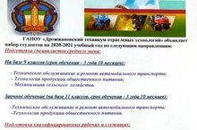 «ДРОЖЖАНОВСКИЙ ТЕХНИКУМ ОТРАСЛЕВЫХ ТЕХНОЛОГИЙ»ГАПОУ «Дрожжановский техникум отраслевых технологий» объявляет набор студентов на 2020-2021 учебный год по следующим направлениям:Подготовка специалистов среднего звена:На базе 9 классов (срок обучения - 3 года 10 месяцев):- Техническое обслуживание и ремонт автомобильного транспорта;- Технология продукции общественного питания;- Механизация сельского хозяйства.Заочное обучение (на базе 11 классов, срок обучения - 3 года 10 месяцев):-Техническое обслуживание и ремонт автомобильного транспорта;-Технология продукции общественного питания.Подготовка квалифицированных рабочих и служащих:На базе 9 классов (срок обучения 2 года 10 месяцев):- Автомеханик.На базе 11 классов (срок обучения - 10 месяцев):- Электросварщик (ручной и частично механизированной сварки).Обучающиеся обеспечиваются государственной стипендией, горячим трехразовым питанием.Нуждающимся предоставляется место в благоустроенном общежитии.Выпускникам выдается диплом государственного образца об уровне образованияи квалификации.Начало работы приемной комиссии – 22 июня 2020 годаПЕРЕЧЕНЬ ДОКУМЕНТОВ ДЛЯ ПОСТУПАЮЩИХ-ЗАЯВЛЕНИЕ-ДОКУМЕНТ ОБ ОБРАЗОВАНИИ (АТТЕСТАТ)-6 ФОТОГРАФИЙ РАЗМЕРОМ 3Х4-КОПИЯ ПАСПОРТА-МЕДСПРАВКА-ХАРАКТЕРИСТИКА-КОПИЯ ПЕНСИОННОГО СТРАХОВОГО СВИДЕТЕЛЬСТВА-КОПИЯ ИНННаш адрес:с. Старое Дрожжаноеул. Дзержинского, 36Контактные телефоны:8(84375)2-28-07, 2-28-82, 2-24-91E-mail : pu-90drojjanoe@rambler.ru -
