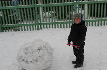 День сегодня теплый. Мы на прогулке стали из липкого снега катать большие шары. Вся игровая площадка была в снежных шарах. И у нас само собой получился конкурс "У кого самый большой шар?".