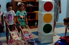 Сегодня мы с детьми повторили правила дорожного движения. Уточнили работу сигналов светофора, дорожные знаки, правила перехода через улицу. Пришла в гости и Красная шапочка.Поиграли в игру "Воробышек и автомобиль"