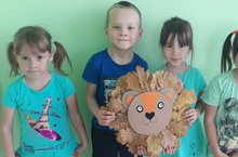 Мы сегодня с детьми сделали из листьев львёнка. Во время работы развивается у детей художественно-творческие способности, воспитывается у детей терпение, усидчивость и фантазия. Мы учим рассматривать осенние листочки разной формы и сравнивать со знакомыми предметами или их частями, показывая аналогии с конструированием из листьев. У детей появляется интерес к созданию образа львёнка из листьев вместе с воспитателем.