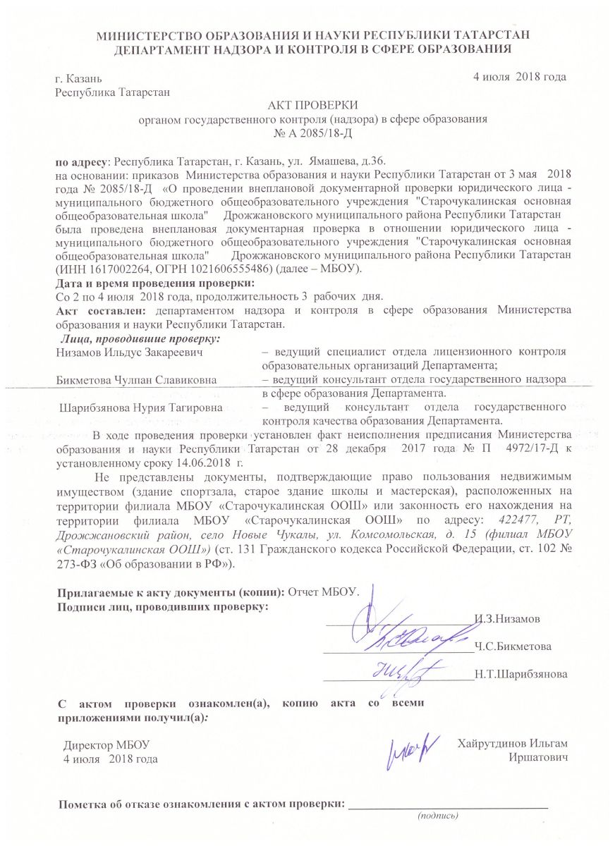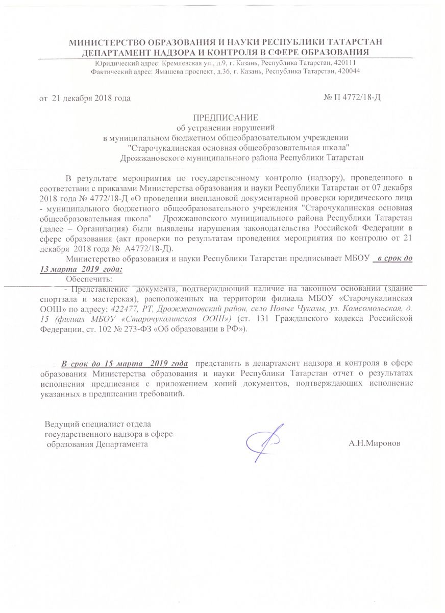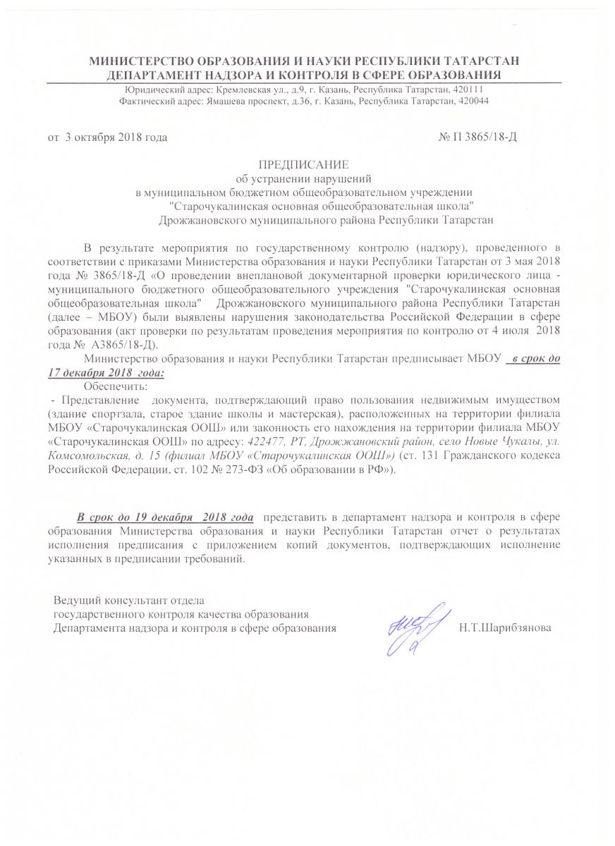 Предписания Департамента надзора и контроля в сфере образования МО И Н РТ от 28.12.2017