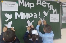 Урок Мира во 2 классе прошел под девизом "Мир детям мира!" Финалом урока стало оформление доски, на котором дети прикрепили символических белых голубей с добрыми пожеланиями.