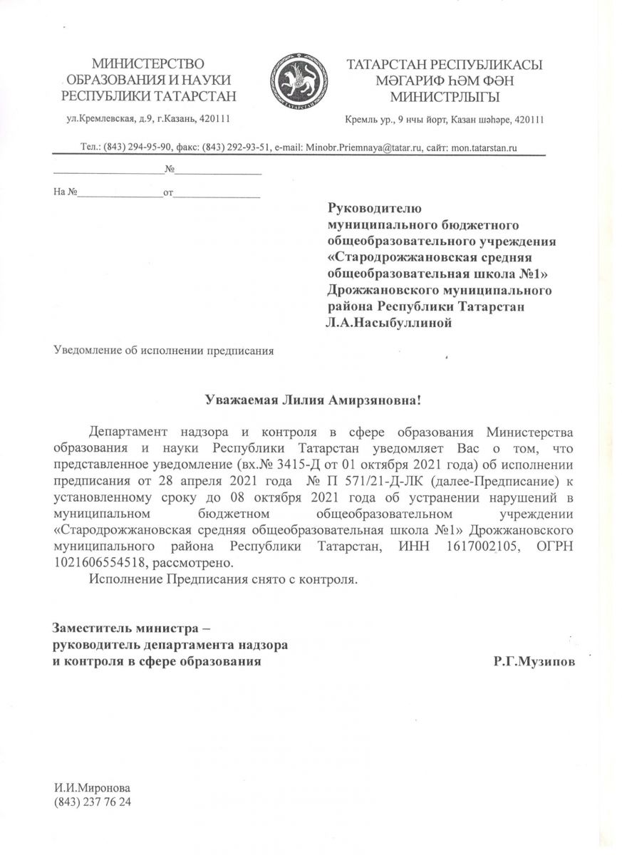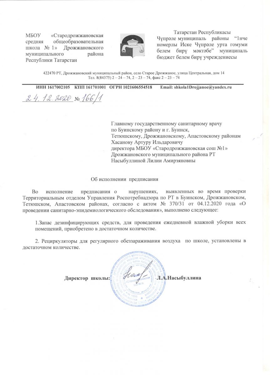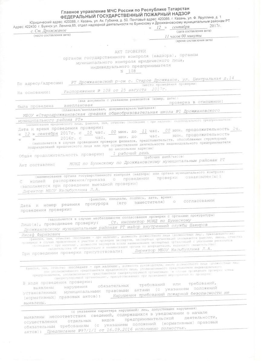 Предписание об устранении нарушений в МБОУ Стародрожжановская сош №1 ДМР РТ №1
