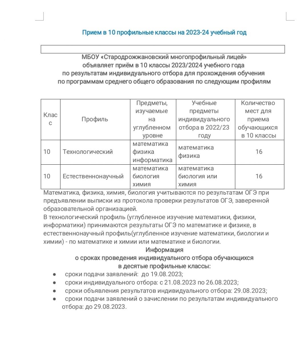 Прием в 10-ые профильные классы 10.08.2023