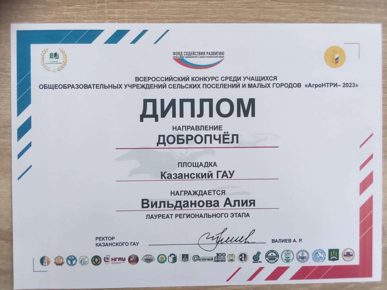 12 мая 2023 года прошел очный региональный этап Всероссийского конкурса «АгроНТPИ». Конкурс проводился по 6 направлениям, 5 из которых являются традиционными: «Агрокосмос», «Агрометео», «Агробио», «Агророботы» и «Агрокоптеры». Впервые была представлена номинация «ДоброПчел», в которой наша обучающаяся 6 класса Вильданова Алия стала лауреатом на финальном этапе в г. Казань. Мы поздравляем Алию и желаем дальнейших побед!
