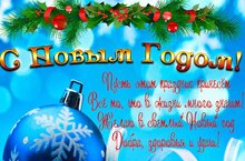 Примите искренние поздравления с Новым годом! Пусть этот год станет стартовой площадкой для новых взлётов, достижений, открытий, побед! Пусть в новом году любое начинание будет обречено на неоспоримый успех, а планы легко и точно реализуются в конкретные дела и мероприятия. Плодотворного, результативного и щедрого на вознаграждения нового года вам!