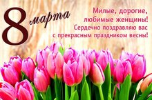Уважаемые женщины! Просим вас принять поздравления с самым нежным, женственным и красивым праздником в году — с 8 марта! Желаем вам всего самого наилучшего: крепкого здоровья, устойчивого достатка, домашнего уюта, успехов в делах, крепкой любви, добрых отношений с людьми… Пусть всё вокруг радует и вдохновляет вас! Чаще смейтесь, улыбайтесь и идите по жизни с оптимизмом! С женским днём вас, любимые!