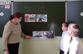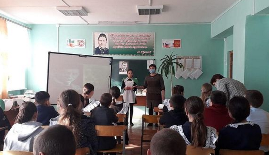 Учащиеся рассказали о тех, кому в 41-м было чуть побольше, чем сегодняшним пятиклассникам, о тех, кто на груди с гордостью носил пионерский галстук или комсомольский значок, совершал бессмертные подвиги. В суровые годы войны пионеры работали на полях, заменяли у станков отцов и старших братьев, ушедших защищать Родину, ухаживали за ранеными, собирали цветной и чёрный металлолом, лекарственные растения, отправляли подарки на фронт, зарабатывали и собирали средства для постройки танков и самолетов. На фоне презентации рассказали о подвигах юных защитников нашей Родины в годы Великой Отечественной войны.
