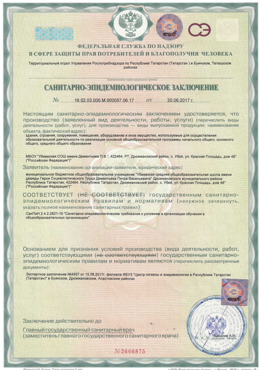 СЭЗ на здания, строения, сооружения, помещения, оборудование и иное имущество, используемые для осуществления образовательной деятельности по реализации основной общеобразовательной программы начального общего, основного общего, среднего общего образования №16.02.03.000.М.000057.06.17 от 20.06.2017 г.