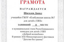 Поздравляем Шигалева Данила, ученика 7 класса, победителя муниципального этапа Республиканского конкурса для детей с ОВЗ "Добрый волшебник", в рамках XXI Международного фестиваля "Детство без границ".