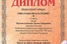Ученица 9 класса Мухамедзянова Лилия (руководитель Ванюшева З.И.) принимала участие во Всероссийском конкурсе "Они сражались за Родину" информационно-методического центра "Алые паруса". По результатам конкурса была удостоена Диплома II степени в презентации совместного проекта "Никто не забыт, ничто не забыто!"