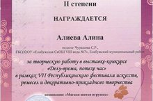 Во время каникул в городе Наб.Челны прошёл Республиканский фестиваль искусств, ремёсел и декоративно-прикладного творчества, в котором приняла участие ученица нашей школы и заняла второе призовое место.