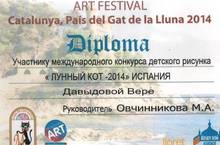 Поздравляем Давыдову Веру, ученицу 9 класса (рук. Овчинникова М.А.), участницу Международного конкурса детского рисунка "Лунный кот - 2014" , организованного ART FESTIVAL Catalunya, Pais del Gat de la Lluna 2014 Испания.