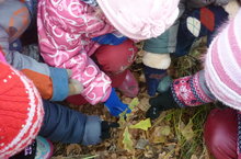 Детишки рассматривают спил березы. На спиле видны годичные кольца. Сколько колец, столько лет дереву.Широкие кольца--это годы, когда было много тепла и дождей и дерево росло особенно быстро. Узкие кольца--память о засушливых, холодных годах, когда рост дерева тормозится. Воспитанники считают годичные кольца и определяют возраст березы.