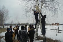 Сегодня в школе прошел День птиц, его провели в два этапа. Первый этап прошел в актовом зале, учащиеся рассказывали о Дне птиц, читали стихи, отвечали на вопросы викторины. Второй этап прошел после уроков, учащиеся развешивали скворечники.