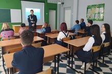В целях профориентации перед учениками старших классов выступил выпускник нашей школы, студент колледжа Государственной и Муниципальной службы г.Ижевска Полькин Георгий. Он ознакомил с условиями поступления в колледж и провёл урок по теме "История создания и развития МЧС России".