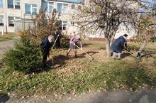 В среднике по уборке опавшей листвы на территории школы приняли участие 10 сотрудников школы.
