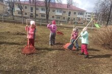 Воспитанники подготовительной группы участвуют в субботнике в детском саду. Вместе с воспитателями они убирают прошлогоднюю траву и листья .