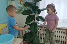 Икенче кечкенәләр төркемендә тәрбияче "Бүлмә үсемлекләрен карау"темасына шөгыль үткәрде. Балалар бакчасындагы бүлмә үсемлекләре-интерьер предметы гына түгел, ә һаваны чистарту чарасы да, сабыйларны табигать белән таныштыру һәм аралашу чарасы да. Шөгыль барышында балалар бүлмә үсемлекләренең нинди булуларын, үсү өчен җир, су һәм һава кирәклеген белделәр, шулай ук лейканы дөрес тотарга, үсемлекләргә су сибәргә һәм эре яфракларын дымлы чүпрәк белән сөртергә өйрәнделәр. Мондый гади хезмәт йөкләмәләре бүлмә үсемлекләре белән кызыксыну һәм аларны карау теләге тәрбияли.