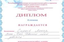 В декабре текущего года воспитанник нашего детского сада Сираев Линар принял участие в Республиканском конкурсе исследовательских работ и проектов детей старшего дошкольного возраста "Я познаю мир", где смог завоевать второе место в секции "Это Родина моя". Поздравляем нашего победителя и его наставника -воспитателя ДОУ Крошечкину Валентину Александровну!