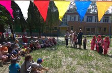 В конце почтили память павших минутой молчания. Все это позволило увековечить подвиг героев Великой Отечественной войны, сохранить память о доблести и героизме советского народа, восстановить и продолжить преемственность поколений.Балалар бакчасында Җиңү көне-ул тынычлык, совет солдатларының фашизмга каршы көрәштә батырлыгына хөрмәт күрсәтү. Безнең балалар бакчасында бу датага карата хөрмәт хисе кечкенәдән тәрбияләнә. Бүген бакчабызда «9 Мая. День Победы. 9 Май. Җиңү көне" исемле чара кысаларында «Без Җиңү варислары» дигән яшь шигырь укучылар бәйгесе оештырылды, анда балалар аерым рәхмәт хисләре белән шигырьләр сөйләделәр, сугыш темасына җырлар, такмаклар башкардылар, биеделәр. Балаларның үз куллары белән ясалган рәсемнәрдән һәм макетлардан оештырылган «Без хәтерлибез. Без горурланабыз» күргәзмәсе бәйрәмгә аерым бер атмосфера бирде. Шулай ук 3 нче өлкән төркем балалары ветеранны өйләренә барып котладылар, матур итеп бизәлгән Георгий тасмасын - Җиңү значогын һәм рәсемнәрен бүләк иттеләр, шигырьләр укыдылар. Балалар музыка залында оештырылган «Солдат чемоданы» мини хәрби музеенда булдылар. Экскурсовод чемодандагы әйберләр турында сөйләде. Бу: фляшка, армия казаны, солдат капчыгы, тельняшка һәм гюйс, пилотка һәм өчпочмаклы солдат хаты һ.б. Соңыннан һәлак булганнарны бер минут тынлык белән искә алдылар. Болар барысы да Бөек Ватан сугышы геройларының батырлыгын мәңгеләштерергә, совет халкының батырлыгы һәм каһарманлыгы турындагы истәлекләрне саклап калырга, буыннар дәвамчанлыгын торгызырга һәм дәвам итәргә мөмкинлек бирә..