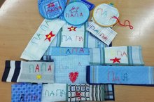 Бәйрәм-Ватанны саклаучылар көне алдыннан безнең мәктәпкә әзерлек төркеме балалары үзләренең иң көчле, яраткан әтиләренә бүләкләр әзерләделәр. Барлык балалар да «әти» сүзе белән ир-ат яулыгы һәм аңа йолдызчык чигеп чыктылар. Балалар башта энә белән эш иткәндә саклык кагыйдәләре белән таныштылар, җепне энәгә төшерергә, тәмамланганнан соң узелны бәйләргә өйрәнделәр. Ә иң гаҗәбе шул, чигү хәтта малайларга да ошаган, ә эшләрне бик пөхтә башкарганнар. Әлбәттә, бала кулы белән ясалган мондый бүләкне бәйрәмгә алу гына түгел, ә аның әтисе улы яки кызы өчен зур горурлык белән күкрәк карманында йөрер дип уйлыйбыз. Балалар белән чигү-релакс та, моторика да, усидчивость да ,шулай ук балалар үзләренең «кул эшләнмәләреннән» - чигүләрдән кичергән гадәти булмаган хис-кичерешләр дә.