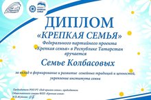 Балалар бакчасы коллективы Колбасовлар Гөлия Рафаил кызы, Николай Калистратович һәм, әлбәттә инде, безнең тәрбияләнүче Алексей, Халыкара гаилә көненә багышланган «Гаилә - илһам чыганагы» Гаилә иҗаты фестивалендә җиңү белән котлый. Гаилә «нәфис сүз»номинациясендә матур чыгыш ясады.