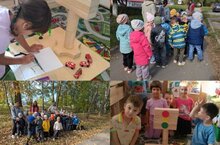 Яфрак коелды, балалар, тәрбиячеләр белән бергәләп, үзләренең уен участокларыннан яфракларны алырга тырышалар.