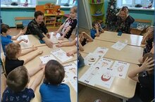 Дети группы №9 детского сада изучают части тела на занятиях татарским языком. Занятие проходит в игровой форме, что позволяет детям легко запоминать новые слова. Воспитатель показывает игрушки или картинки, называя части тела на татарском языке, дети повторяют вслед за ним. Затем ребята играют в игры, где нужно показать или назвать определенную часть тела. Например, воспитатель просит поднять руку («кул»), топнуть ногой («аяк») или потрогать свой нос («борын») Такие занятия помогают развивать память, внимание и мелкую моторику детей, а также способствуют формированию интереса к изучению родного языка. Родители активно участвуют в процессе воспитания, дома вместе с ребенком закрепляя пройденный материал.