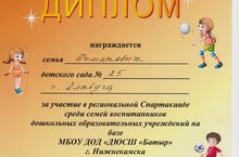 27 февраля 2016г. в г. Нижнекамске в Региональной Спартакиаде среди семей воспитанников дошкольных образовательных учреждений на базе МБОУ ДОД "ДЮСШ "Батыр", семья нашей воспитанницы Романовой Агнессы, которая входила в команду г.Елабуги заняла 4 место. Молодцы!