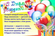 Сегодня нашему детскому саду 37 лет. Поздравляем всех с этим чудесным праздником — с днем рождения сада! Хотим всем сотрудникам, воспитанникам пожелать крепкого здоровья, мирного неба и большого счастья. Пусть в стенах сада раздаются звонкие голоса и радостный детский смех. Здесь кормят вкусно и полезно. Здесь играют весело и интересно. Здесь учат смелости и доброте. Здесь рисуют и танцуют. Здесь поют и любят спорт. Пусть так будет всегда. Желаем ,чтобы в наш замечательный сад приходило много малышей. Желаем, чтобы уходили от нас дети отважными, умными, целеустремленными и дружными.