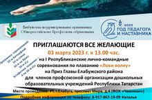 Приглашаются все желающие 03.03.2023 г. в ФОК "Чемпион" на республиканские соревнования по плаванию "Лови волну" на Приз Главы Елабужского муниципального района среди членов профсоюза дошкольных образовательных учреждений.