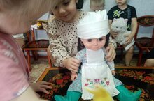 Бүген 3 нче номерлы "Теремкәй" балалар бакчасының 2 нче кечкенә балалар төркеме балалары белән татар халык киеме кигән курчаклар белән режим мизгелендә уеннар оештырдык. Мондый уеннар балаларда Идел буе халыкларының киемнәренә кечкенәдән үк кызыксыну уяту йөзеннән уздырыла. Балаларга кечкенәдән үк үзара дус тату, мәрхәмәтле булырга кирәклеген төшендерергә тырышабыз.