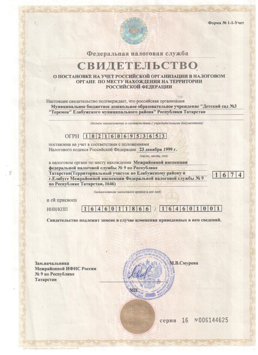 Свидетельство о постановке на учет в налоговом органе по месту нахождения