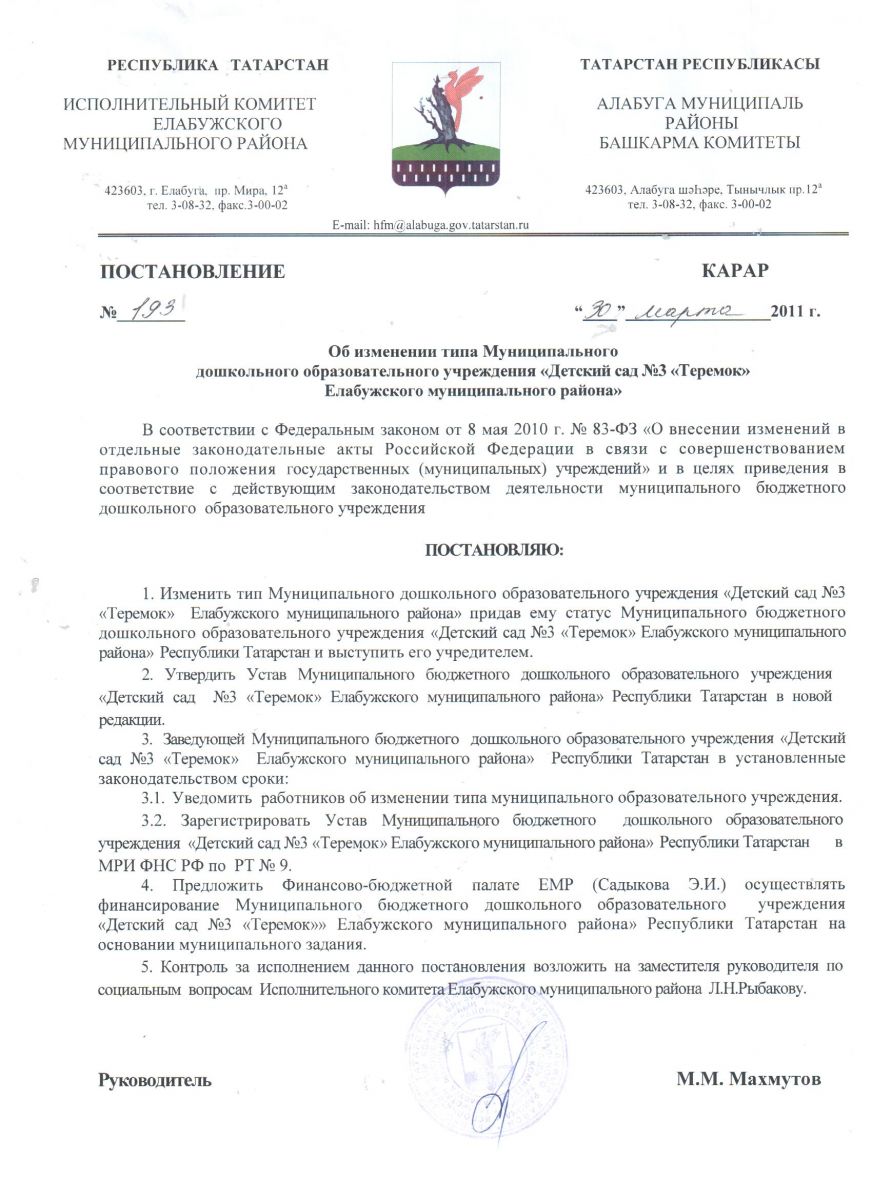 Постановление об изменении типа МБДОУ "Детский сад №3 "Теремок" ЕМР" РТ