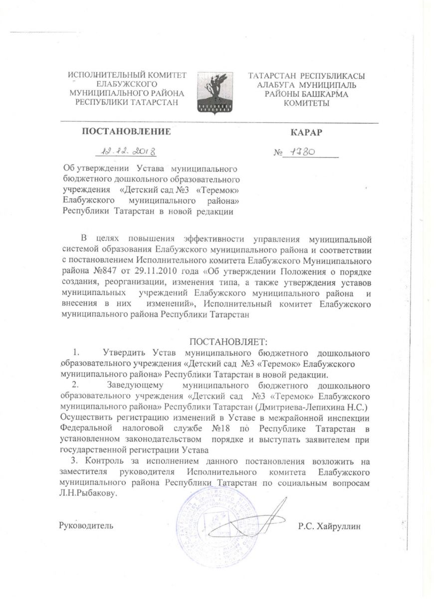 Постановление об утвеждении Устава МБДОУ "Детский сад №3 "Теремок" ЕМР" РТ