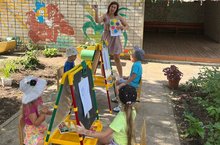 В летний день в нашем детском саду с детьми была организована творческая работа по рисованию с использованием красок, карандашей, мелков и др. Дети вспомнили о известных художниках ,таких как И.И Шишкин. Нарисовали пейзаж. Пленэр на свежем воздухе оказался еще интереснее, когда вокруг тебя цветущие растения и деревья!