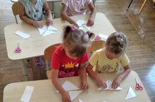 Старшая группа- это, вам, не средняя! Тут занятия сложнее. Сначала из прямоугольника нужно сделать ровный квадрат, потом разрезать его по диагонали на треугольники.. А из этих треугольников, обратно квадрат, ну, никак не складывается! Но, мы постарались и у нас всё получилось!