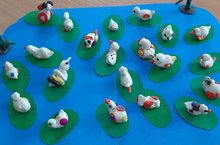 Лепка для детей не только веселое и увлекательное, но и очень полезное занятие. Её значение в развитии ребенка трудно переоценить. Она оказывает благотворное влияние на эмоциональное состояние ребенка, является одним из средств познания мира и развития восприятия. На пятом году жизни стремительно развиваются мыслительные способности. Ребёнок сопоставляет объекты окружающего мира, обнаруживает связи и взаимодействие между ними. Первый сюжет — это коллективная композиция «Утята плавают на пруду».