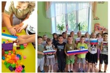 Флаг көнен бәйрәм итү кысаларында, безнең балалар бакчасында тематик әңгәмәләр үткәрелде, иллюстрацияләр каралды, открыткалар һәм рәсемнәр ясалды, шулай ук өлкән төркем тәрбияләнүчеләре төрле конструктордан Россия флагы төзеделәр.