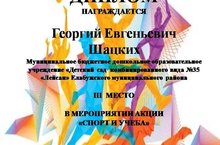 В здоровом теле, здоровый дух. Это прекрасный девиз для профессионалов и просто для любителей спорта. С самых маленьких лет и до глубокой старости, мы не расстаёмся со спортом. Занятия физкультуры всегда помогают нам быть в форме. С 13 апреля по 5 мая в городе Елабуга проводилась акция «физкультурадома» где воспитанник 8 группы Шацких Георгий занял почетное 3 место. Мы от души поздравляем нашего победителя. Желаем новых спортивных побед, радости и вдохновения. Пусть звезда славы не угасает, силы копятся, а здоровье позволит всё это осуществить в лучшем виде!